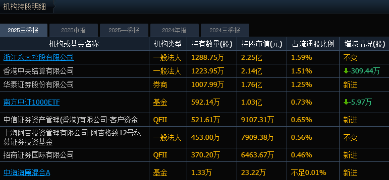 《星岛》查询发现,截至9月末,机构持股明细包括一家券商、两只基金、两只QFII和一家私募基金,其中有四家为新进。