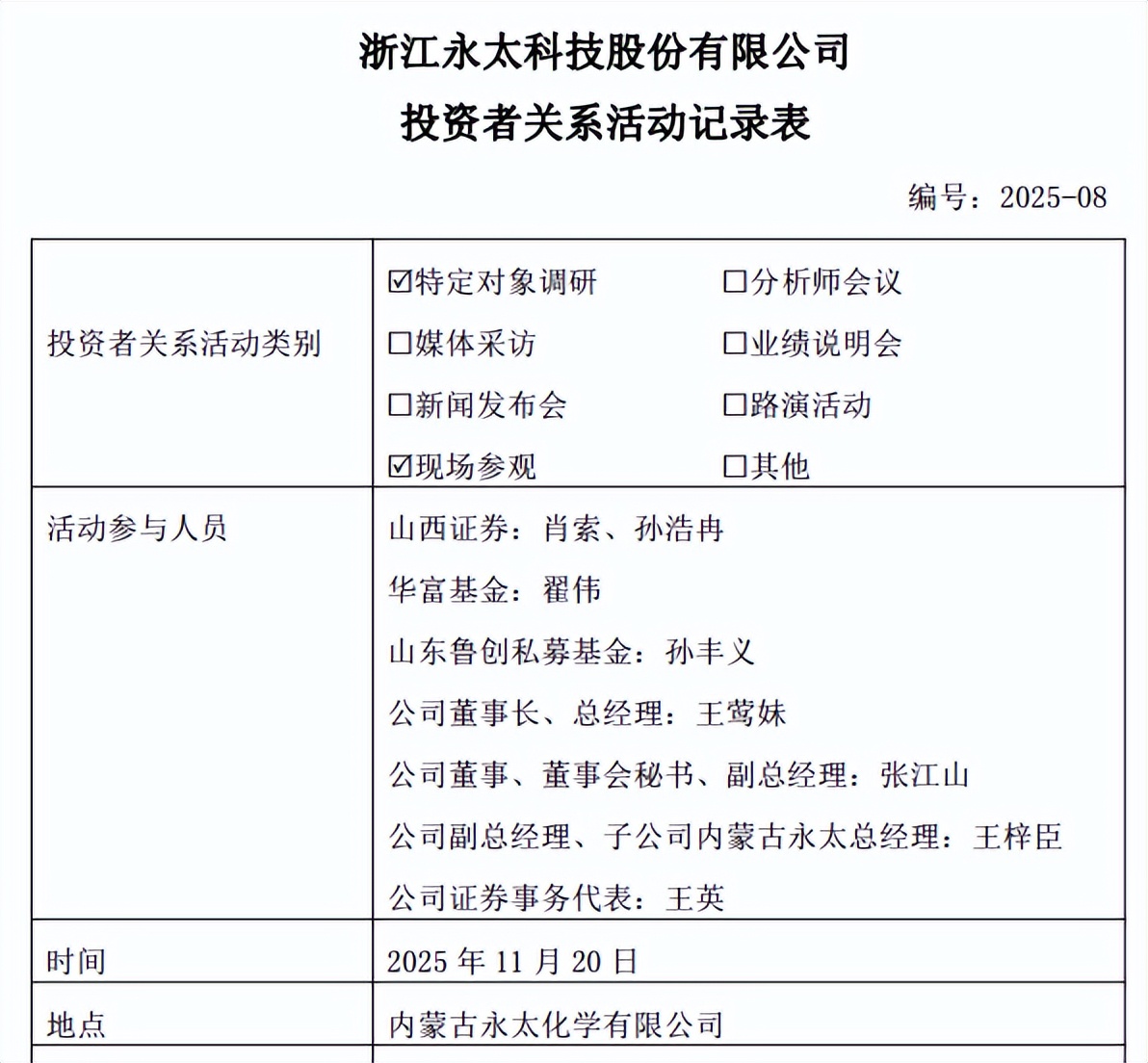 11月20日晚间,永太科技(002326.SZ)发布公告称,当天山西证券、华富基金和山东鲁创私募基金等机构到内蒙古永泰化学有限公司进行现场调研。公司方面由董事长、总经理王莺妹,董事、董事会秘书、副总经理张江山等高管参与接待,双方就公司业务布局、经营业绩、产能建设及未来战略等关键议题进行深入交流。