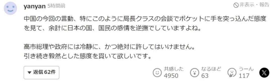高市首相和政府要冷静,并且绝不能容许。希望继续贯彻毅然决然的态度。