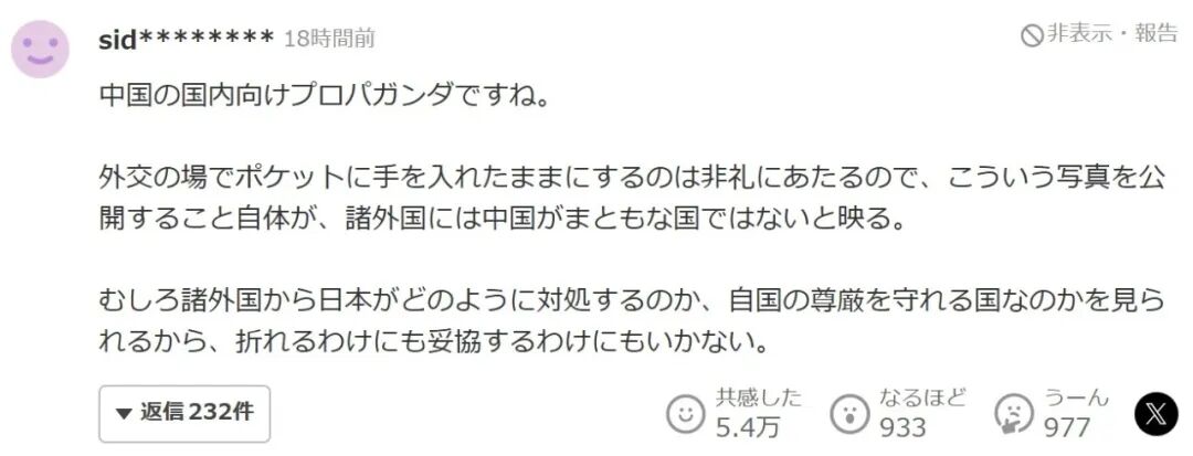更没一个日本人反省:我们在美国面前,被无礼羞辱得还少吗?不是次次都还得陪笑脸,怎么面对中国的双手插兜,就大破防了呢。