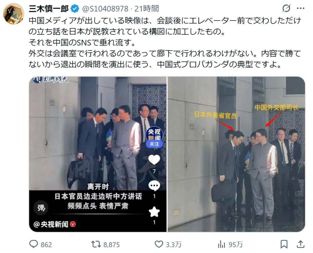 中国媒体放出来的视频,会谈结束后,只是站在电梯前交谈而已,却被加工成“日本在听训话”的构图。