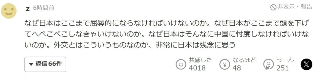 日本为什么必须屈辱到此种地步。日本为什么必须低头,低声下气到此种地步。日本为什么必须对中国那么小心揣摩。所谓外交,就是这样的吗,对日本感到非常遗憾。