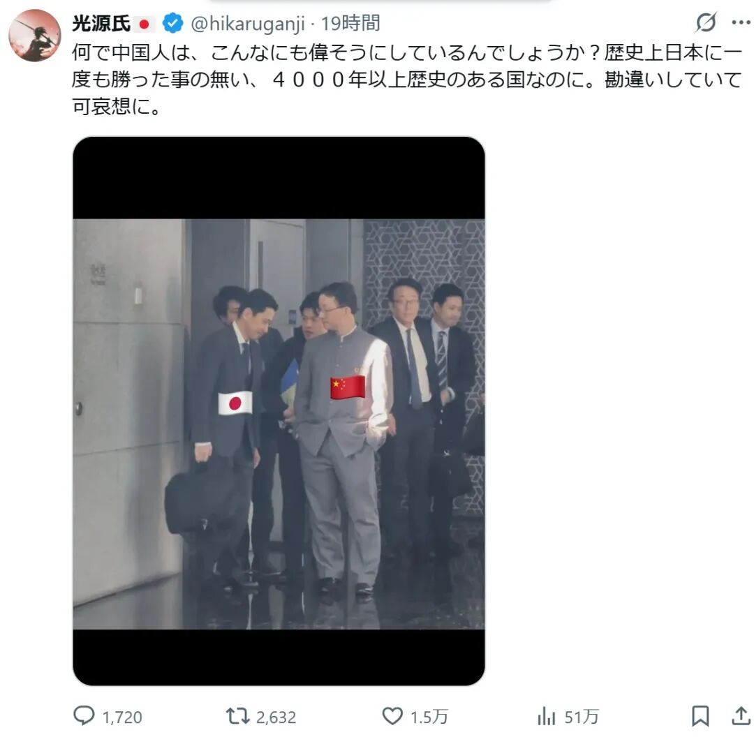 为什么是中国人,这么傲慢的样子?一个拥有4000年以上历史的国家,却在历史上,一次都没赢过日本。拎不清状况,真可怜。