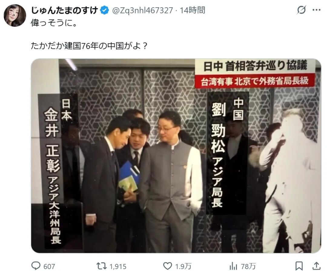 看到中国这次的言行,尤其在这种局长级会谈,双手插兜的态度,更加逆抚了日本这个国家和老百姓的感情。