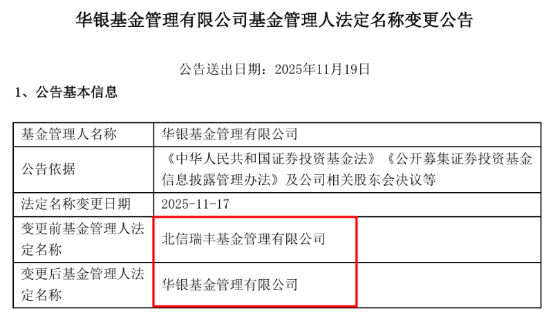11月19日,北信瑞丰基金公告宣布,公司正式更名为**“华银基金管理有限公司”(下称“华银基金”)。**