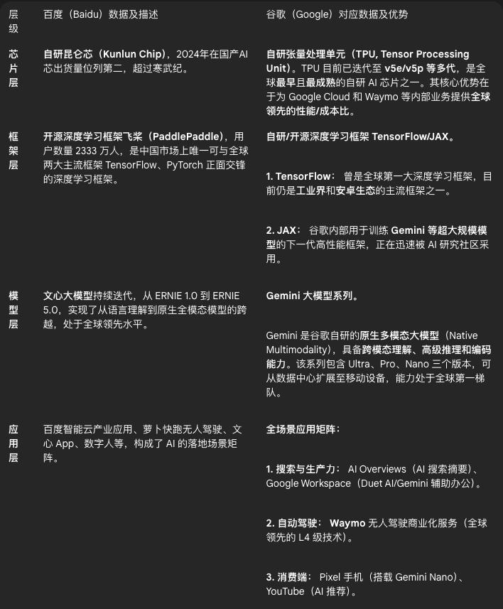 尤其是芯片层,百度和谷歌都明白,要保持 AI 领先,就必须掌握底层硬件,自己设计芯片,自己优化软件,跑自己的模型,这能带来更高的性能和更低的成本。