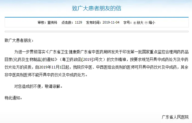 2019年,某三甲医院公告非中医类别医师不能开中药相关处方