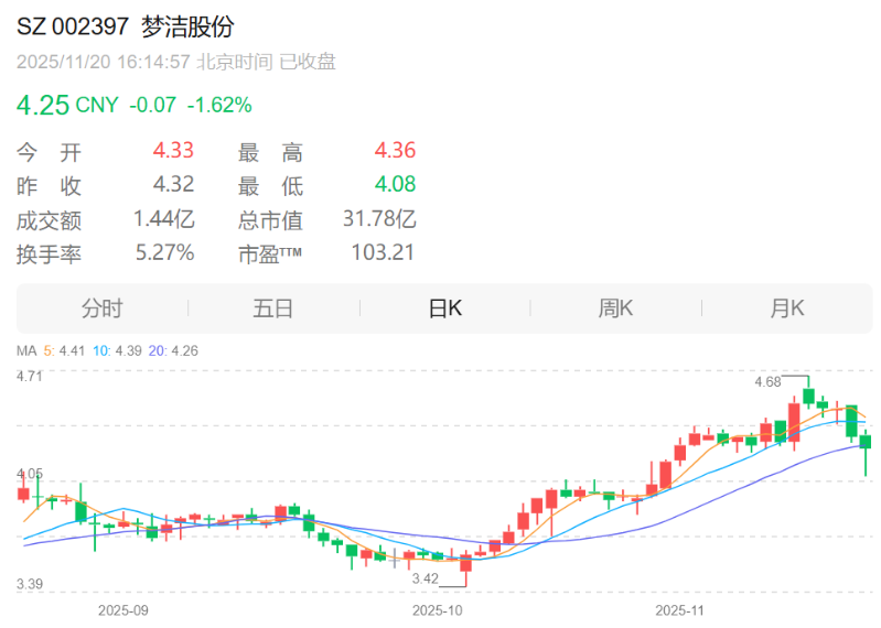 本周以来,梦洁股份股价连日下挫,截至11月20日收盘,累计下跌5.97%,报于4.25元/股,总市值31.78亿元。