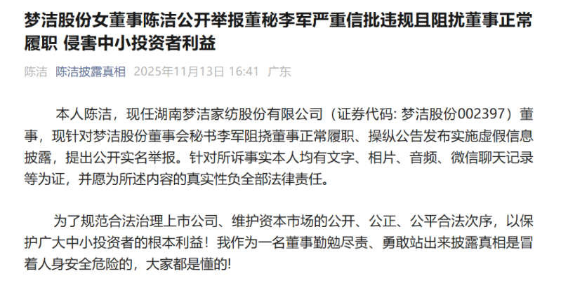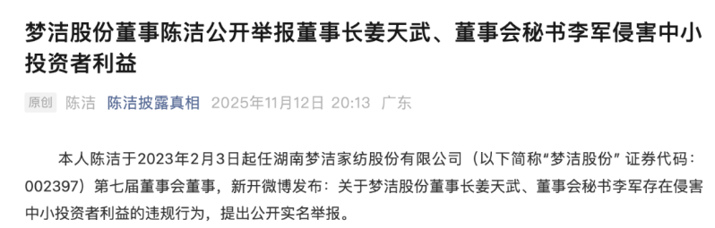 11月12日和13日,微信公众号“陈洁披露真相”发表了两篇“公开实名举报”文章,作者自称为梦洁股份董事陈洁,内容直指梦洁股份董事长姜天武、董事会秘书李军侵害中小投资者利益,涉及可能“包庇”巨额职务侵占、严重信披违规及阻挠董事正常履职等行为。