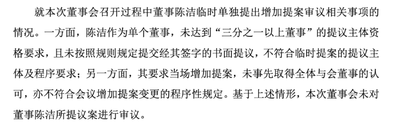 陈洁还列举了5次李军虚假披露公开信息的情况。她认为李军的这些行为严重侵害了董事权利,侵害了资本市场信息披露的公开、公正、公平原则,为公司治理埋下了巨大隐患。
