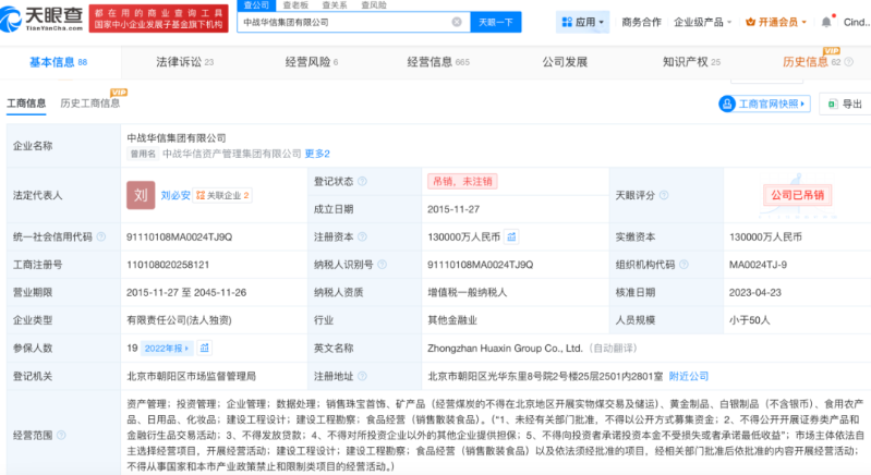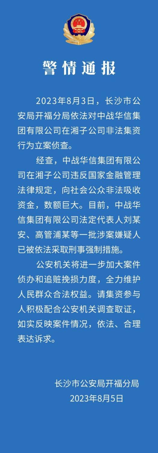 而刘必安还是中战华信集团的法定代表人、董事长、经理。据媒体报道,2023年中战华信集团在湖南的子公司因非法集资数额巨大被立案侦查,刘必安等涉案嫌疑人已被依法采取刑事强制措施。