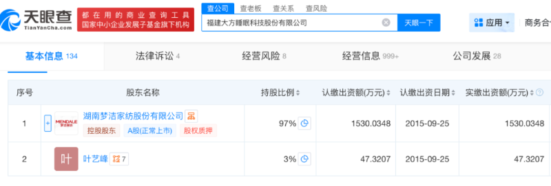 天眼查显示,大方睡眠成立于2010年,叶艺峰曾任董事长、法定代表人,今年5月变更为温剑。目前,叶艺峰依然持有大方睡眠3%的股份,另外97%由梦洁股份持有。