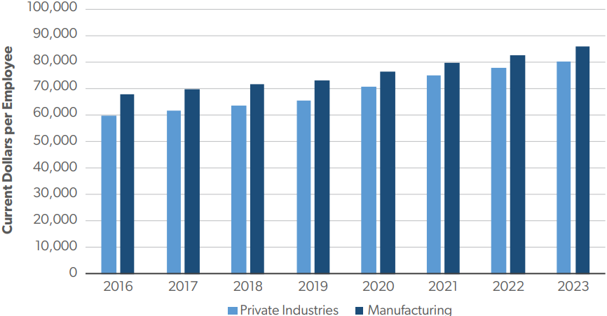 2016-2023年美国私营部门和制造业员工的工资水平状况