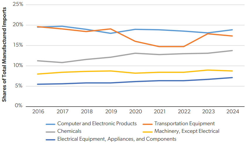当下,进口占消费份额的增长趋势引发了特朗普政府的高度关注,并推动了美国的制造业回流战略。在关税政策制定者看来,美国在制成品进口上有5大“受害行业”:计算机和电子产品、运输设备、化学品、机械(电气除外)以及电气设备、电器和组件。具体来看,这五大类中,计算机和电子产品的进口份额稳步上升,而交通运输设备的进口份额则存在波动。关税倡导者大力抨击汽车及零部件的进口,以及由此带来的失业。然而,与汽车行业不同,化工和机械行业并不是国家制造业实力的根基。因此,给这些行业扣上帽子也显得不伦不类。