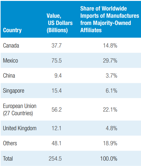 2022年美国主要外国子公司向母公司出口的制造业数额与占比