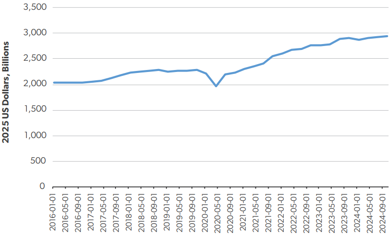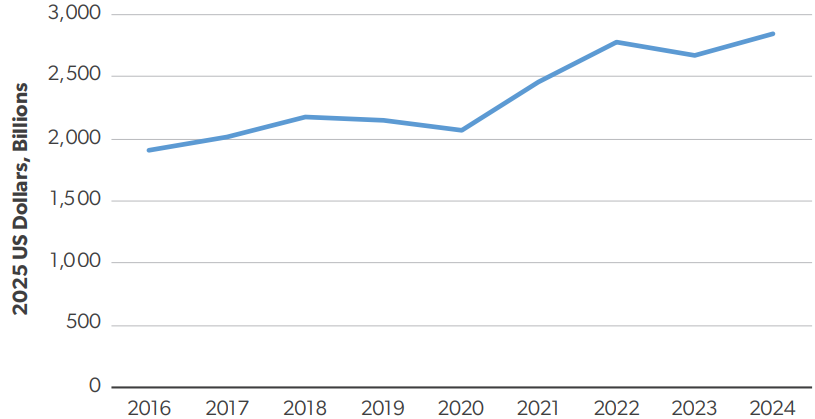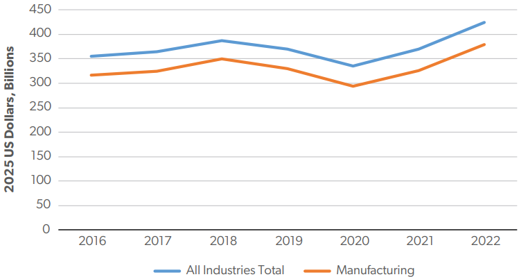 美国2016-2024年制造业增加值(单位:十亿美元)