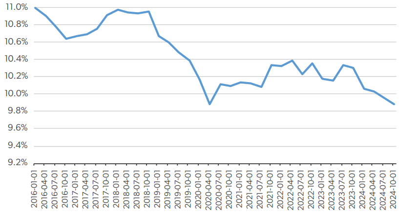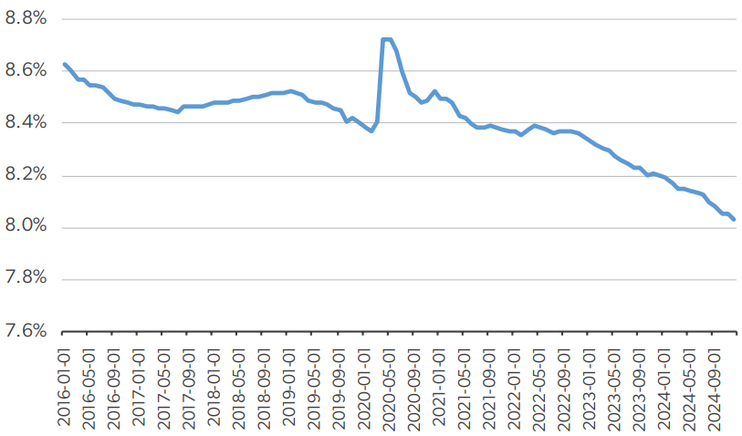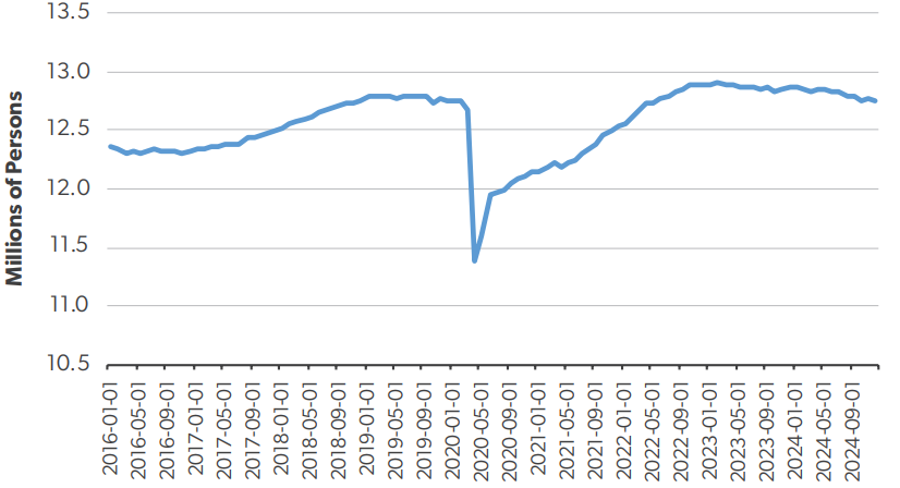 下图显示了2016年至2024年间美国制造业的就业人数。在不到十年的这一周期内,从事制造业的工人数量比例下降了约0.6%。在美国和其他发达国家,制造业就业比例下降是一个长期趋势。在1960年至1968年的“黄金岁月”中,平均约有27.5%的美国工人在制造业领域工作。特朗普关税议程的一个潜台词是夺回那个时期的就业岗位。