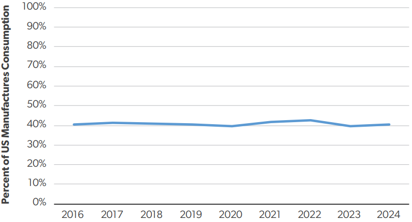 在2016年至2024年期间,美国的进口额稳定在消费额的41%左右,这意味着,进口和消费的增长速度大致相同。而在1960年代的“黄金岁月”,进口量约占制成品消费的3%。