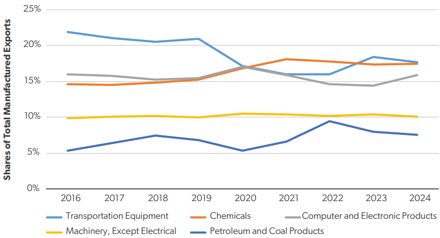 然而,即使是批评美国大规模进口制成品的政客也承认,这对美国经济繁荣的贡献。下图显示了美国前五大的出口产品类别。大多数出口类别与进口类别具有相似性,但有两个例外:石油和煤炭产品是主要的出口产品,而电气设备是主要的进口产品。