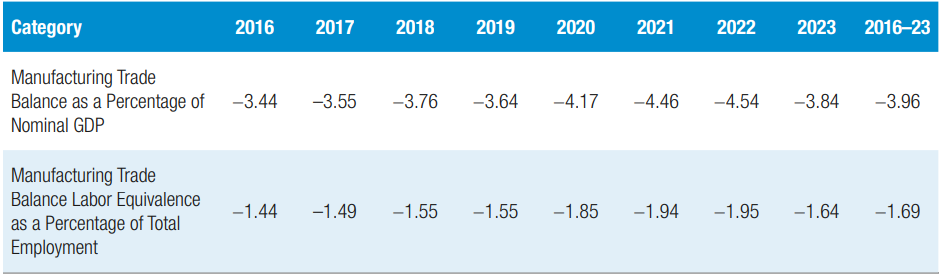 2016-2023年美国制造业的贸易平衡与国内劳动力的等价关系