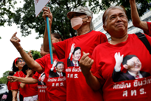 2025年8月22日,泰国曼谷,泰国前总理他信·西那瓦的支持者(红衫军)在曼谷刑事法庭外等待他信诽谤王室案的裁决。