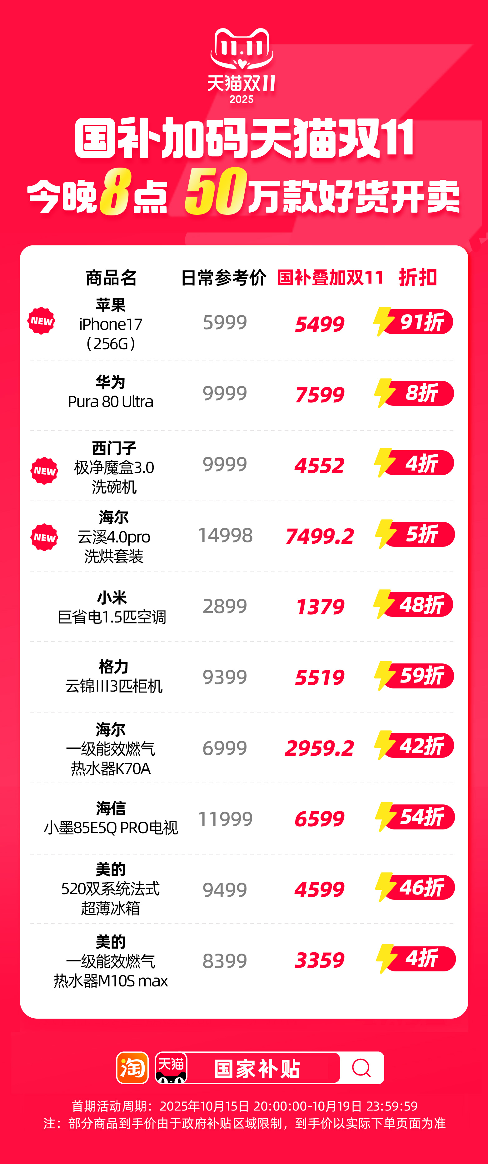 2025年第四波国补资金重磅落地,今晚8点,天猫双11国补5折开卖!