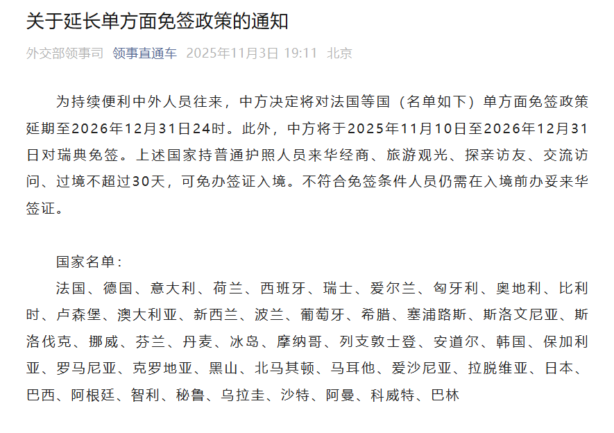 微信公众号“领事直通车”11月3日消息,为持续便利中外人员往来,中方决定将对法国等国(名单如下)单方面免签政策延期至2026年12月31日24时。此外,中方将于2025年11月10日至2026年12月31日对瑞典免签。上述国家持普通护照人员来华经商、旅游观光、探亲访友、交流访问、过境不超过30天,可免办签证入境。不符合免签条件人员仍需在入境前办妥来华签证。