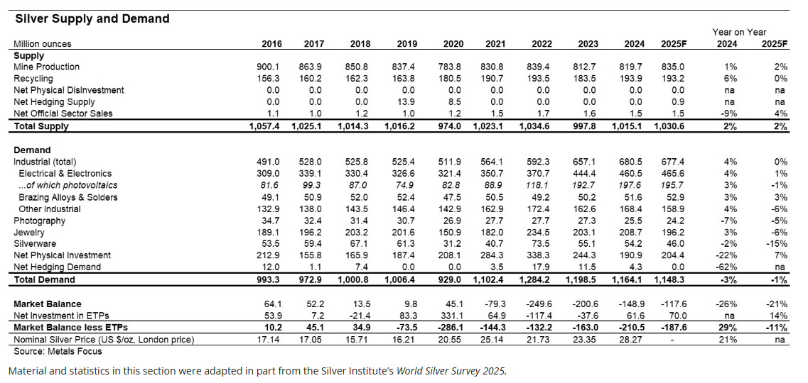 按世界白银协会(Silver Institute/Metals Focus)的口径,全球白银已连续4年(2021–2024)供不应求,且2025年预计将出现第5年的年度缺口。其中在2022年缺口一度达到2.5亿盎司。