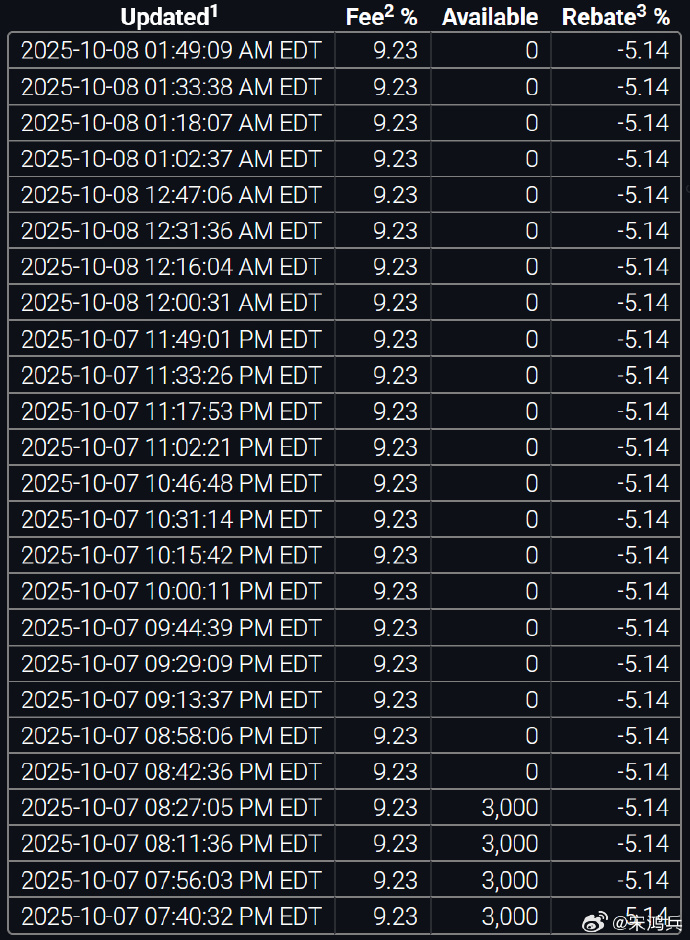 宋鸿兵在其个人微博发帖称:“全球最大的白银ETF份额(SLV)的租借利率从10月6日的2.53%一度飙升到9.82%,从7日晚8点起,SLV份额可租借量直接降到了0!8日早上,伦敦银跳涨到48.7美元,而伦敦金突破了4050美元,伦敦银陷入现货大幅溢价”。