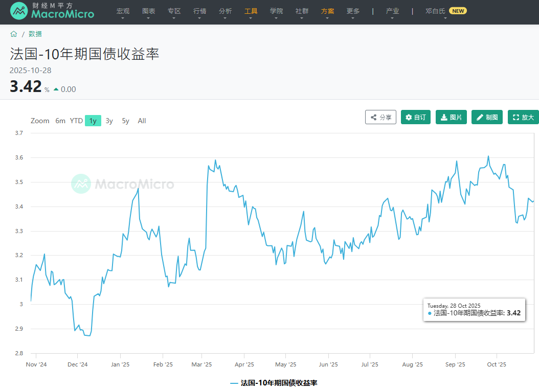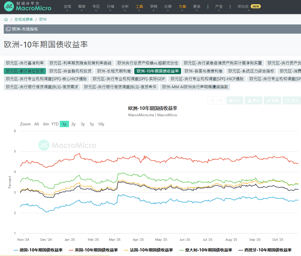 法国十年期国债高企,欧洲十年期国债收益率几乎对欧洲央行降息无动于衷 MacroMicro