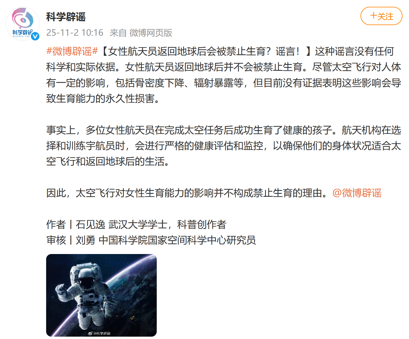 女性航天员返回地球后会被禁止生育?中国科协:谣言