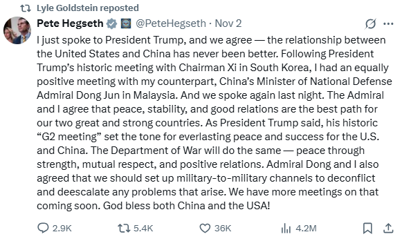 莱尔·戈德斯坦转发了美国战争部长赫格塞思发布的帖文。帖文的开头写道:“我刚刚与特朗普总统交谈过,我们一致认为——美中关系从未如此良好。”