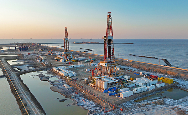 3月18日,东营市渤海湾区域,中石化胜利油田部署两部钻机加足马力进行石油钻探施工。 视觉中国