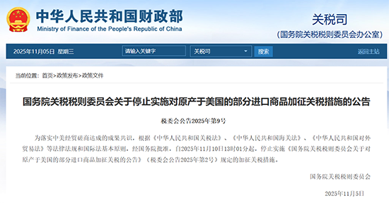 为落实中美经贸磋商达成的成果共识,根据《中华人民共和国关税法》、《中华人民共和国海关法》、《中华人民共和国对外贸易法》等法律法规和国际法基本原则,经国务院批准,自2025年11月10日13时01分起,停止实施《国务院关税税则委员会关于对原产于美国的部分进口商品加征关税的公告》(税委会公告2025年第2号)规定的加征关税措施。