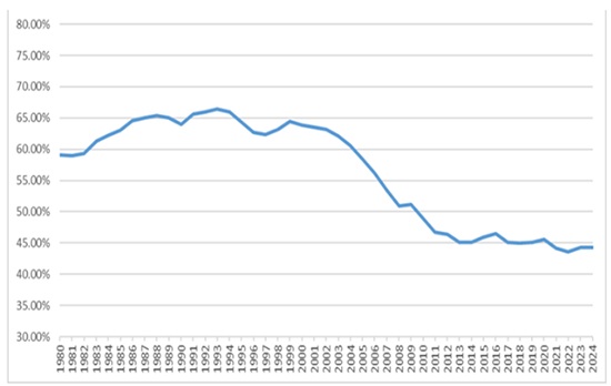 2008年全球爆发金融危机,全球同步采取财政货币扩张政策救市,全球经济逐步恢复后,主要国家债务负担率却没有下降。自2008年起,美国债务负担率从50%跃升至100%的水平后始终未能回落。除了2008年的全球金融危机以外,2008年另一个关键转折点是欧美人口结构的变化。数据显示,2000年以后欧洲抚养比出现结构性转折,至2008年前后老年抚养比例持续攀升,财政压力显著加大,美国的情况也与之相似。从2008年至今,欧美国家普遍面临老龄化加剧、产业空心化的情况,叠加新冠疫情的冲击,一步步强化了上述趋势。2020年全球疫情期间美国采取紧急刺激措施,通过直接发放现金以维持消费,使债务负担率经历了第二轮攀升,终于达到120%的高位,当年美国债务率正式突破二战时期峰值,成为影响全球政治、金融与资本市场的重要转折点,其后续影响仍在持续显现。此外,一个值得关注的历史数据是,克林顿在任期最后一年曾实现两千多亿美元的财政盈余。而1999-2001年也是金价自1980年以后价格最低的时间段。