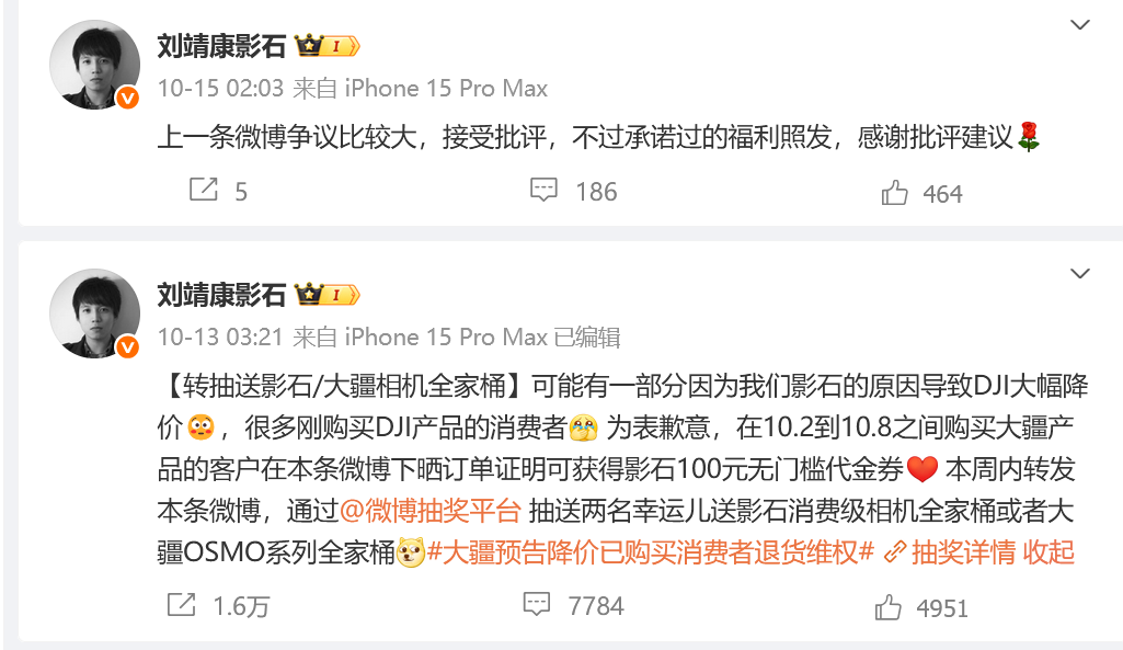 未曾想,影石的董事长刘靖康却为大疆的降价而道歉。当时,刘靖康表示,可能有一部分因为影石的原因导致大疆大幅降价,为表歉意,在10月2日到10月8日之间购买大疆产品的客户,在微博下晒订单证明可获得影石100元无门槛代金券。
