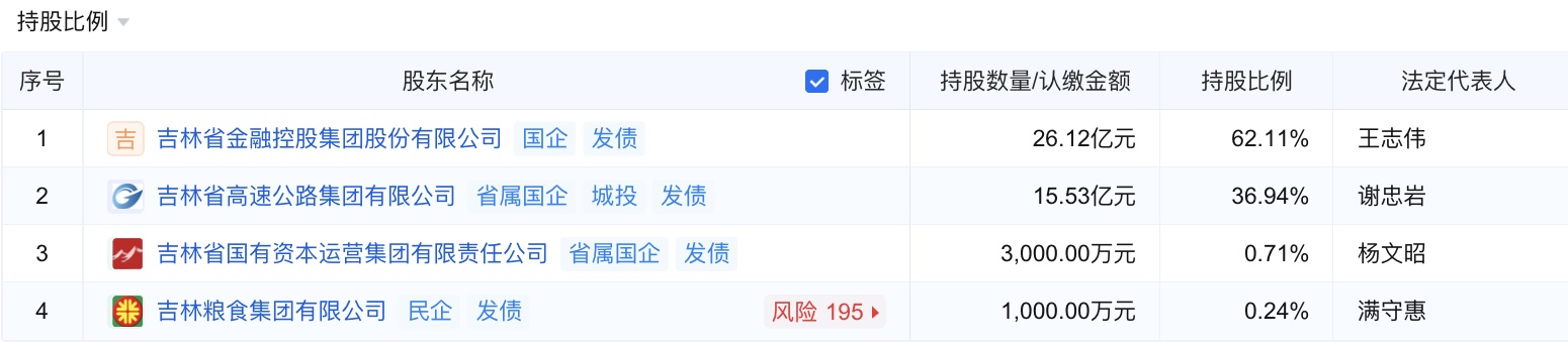 目前,吉林信托的四大股东清一色为省属国企:吉林省金融控股集团持股62.11%,吉林省高速公路集团持股36.94%,吉林省国有资本运营集团持股0.71%,吉林粮食集团持股0.24%。作为吉林省唯一信托法人机构,该公司已形成控股天治基金、天富期货,参股东北证券、九台农商行、吉林银行等的综合金融版图。
