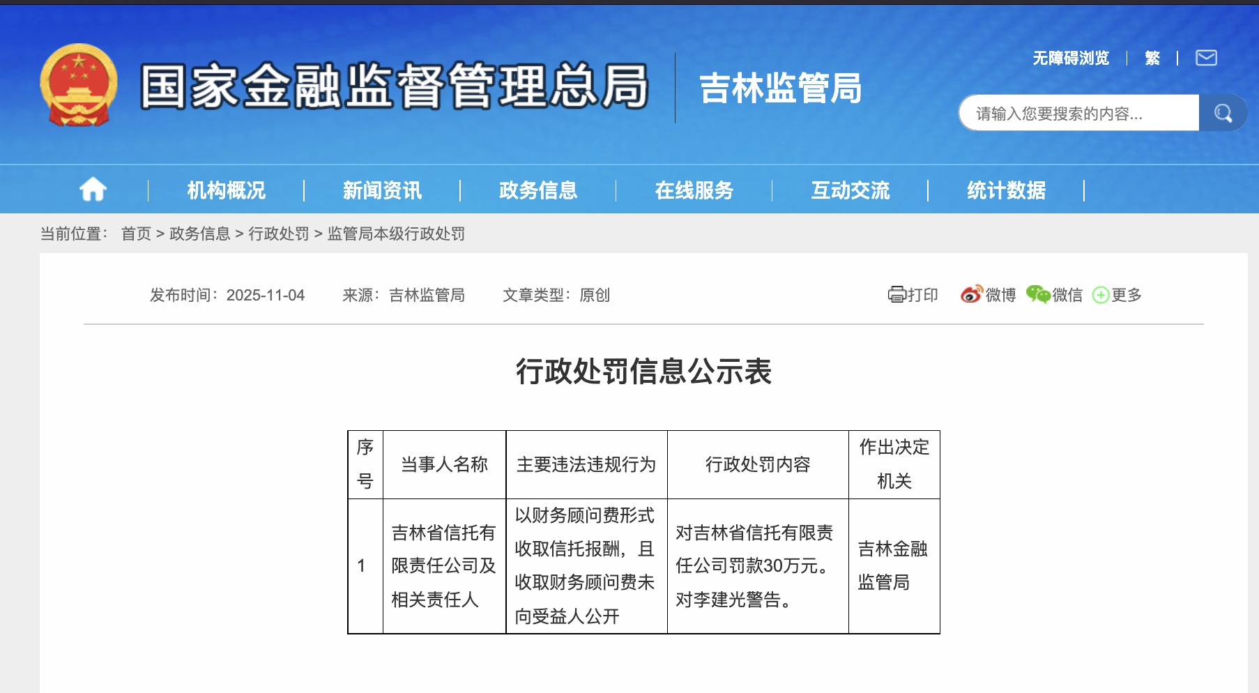 11月4日,国家金融监督管理总局吉林监管局再次开出罚单:吉林信托因“以财务顾问费”形式收取信托报酬,且未向受益人公开,被罚30万元。这是该公司年内第二次被公开处罚。