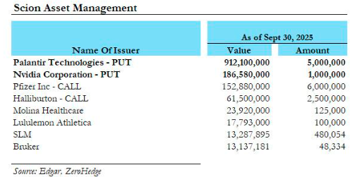 11月4日,电影《大空头》原型人物、知名投资者迈克尔・伯里(Michael Burry)旗下Scion资产管理公司,提前两周披露三季度13F持仓报告,以实际行动兑现其此前的AI泡沫警告——大举做空英伟达(NVIDIA)与人工智能软件公司Palantir两大AI龙头,相关空头头寸占其投资组合权重的80%。