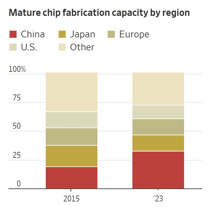 **其二是半导体领域。**报道指出,目前中国占据全球约三分之一的成熟制程半导体产能,这类芯片虽生产难度低于尖端芯片,却是汽车、消费电子和国防等行业的关键组件。为实现自给自足,中国已投入数十亿美元建设半导体制造能力。