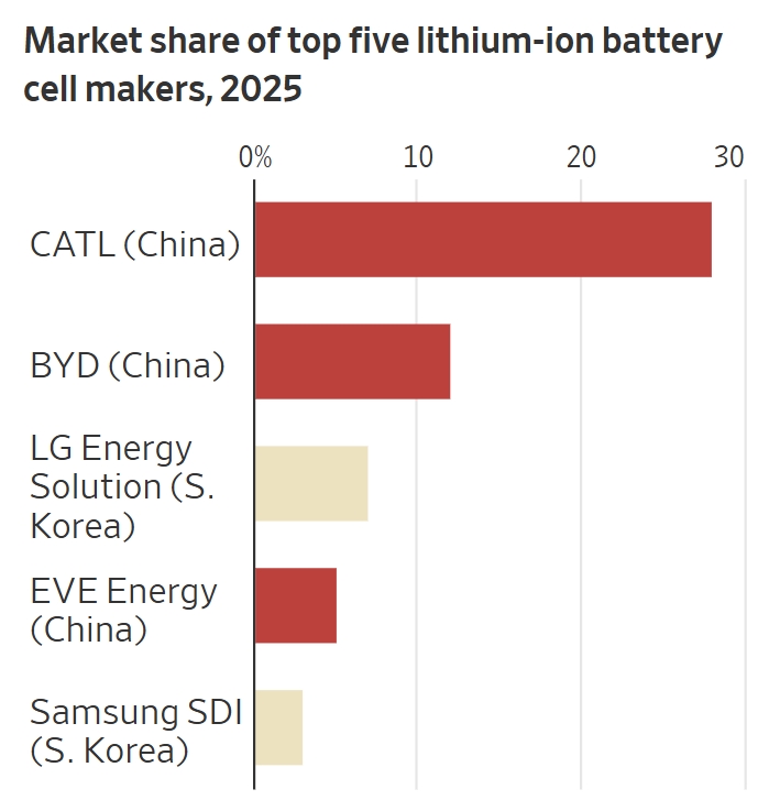 2025年五大锂离子电池电芯制造商市场份额:排名依次为宁德时代、比亚迪、LG能源解决方案、亿纬锂能、三星SDI。《华尔街日报》制图