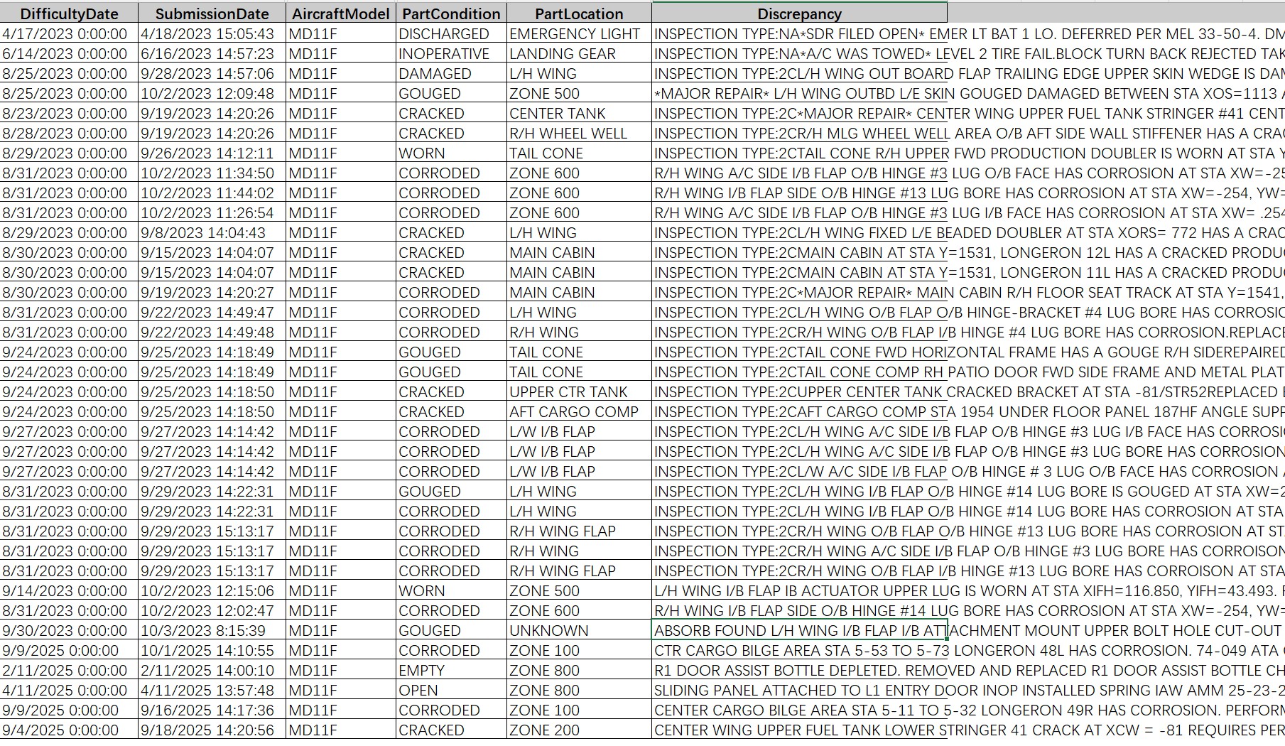 但相比社交媒体上的传言,FAA上该飞机近几年的维修记录则是官方认证的材料。从2023-2025年的维修记录中我们可以看到,包括飞机左翼襟翼铰链支架、前缘加衬板等,有较多的开裂或磨损维修记录。而中翼油箱则更触目惊心了,中央翼油箱的纵梁、长桁等结构件多次发现裂纹。事故发生前几周,机身纵梁上也发现有裂纹。