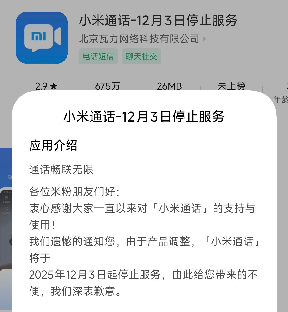 11月5日,小米通话APP发布公告称,由于产品调整,将于12月3日停止服务。