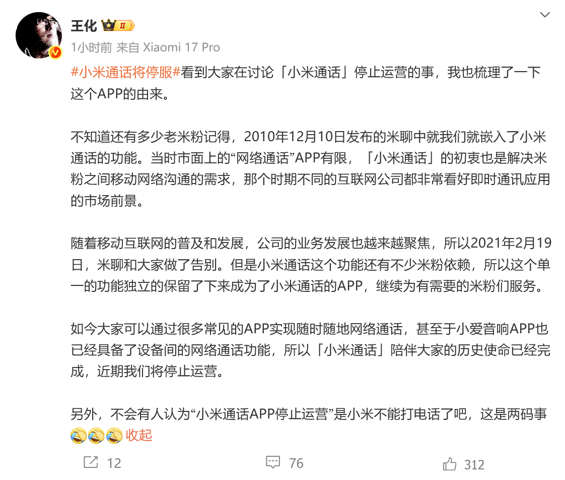“如今大家可以通过很多常见的APP实现随时随地网络通话,甚至于小爱音响APP也已经具备了设备间的网络通话功能,所以小米通话陪伴大家的历史使命已经完成,近期我们将停止运营,”王化写道。