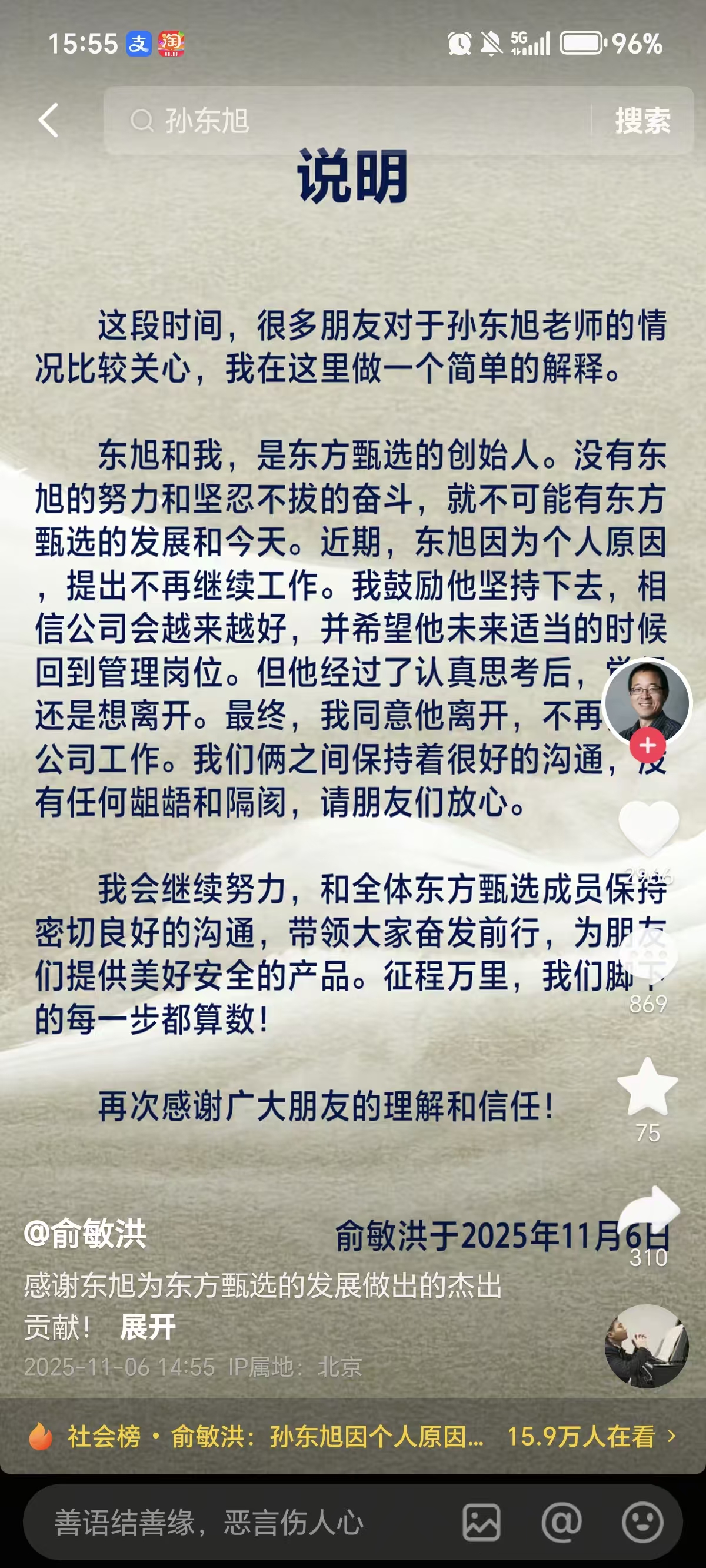 11月6日,俞敏洪在抖音账号上发文确认孙东旭离职。