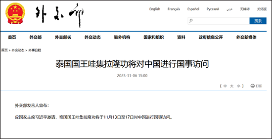 泰国国王哇集拉隆功将对中国进行国事访问 guancha 2025-11-06 外交部网站11月6日消息,外交部发言人宣布: 应国家主席习近平邀请,泰国国王哇集拉隆功将于11月13日至17日对中国进行国事访问。