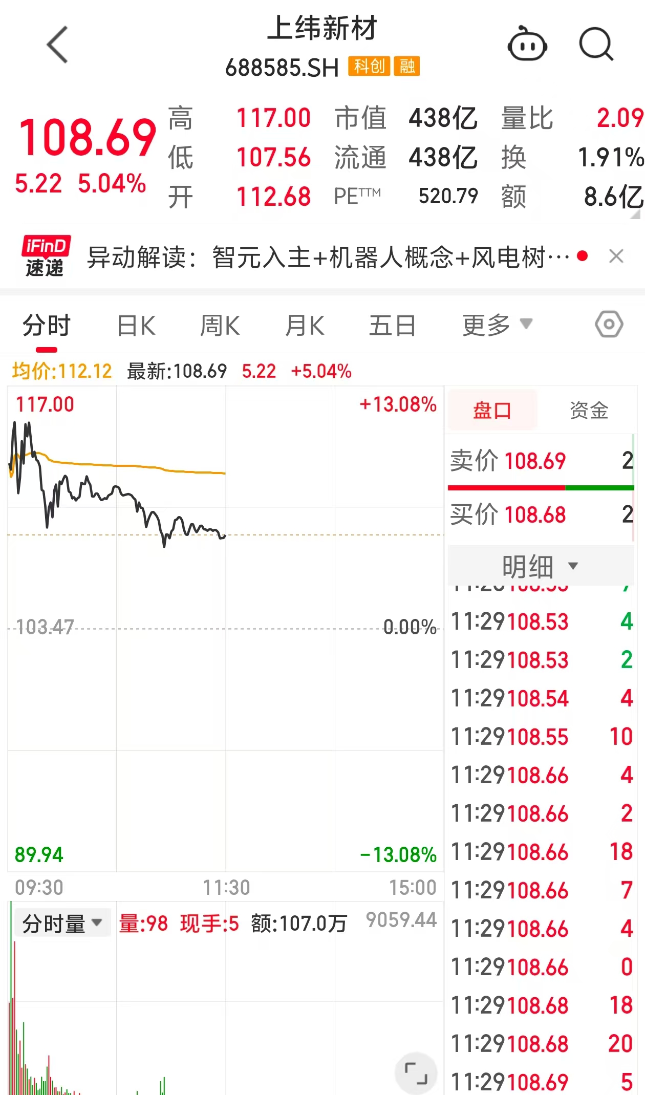 据悉,截至午市收盘,上纬新材涨5.04%,报108.69元每股。