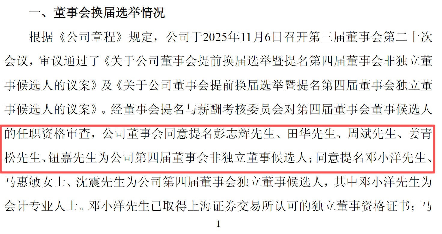 此外,上纬新材还发布公告称,第三届董事会第二十次会议于11月6日召开,彭志辉、田华、周斌、姜青松、钮嘉为第四届董事会非独立董事候选人,邓小洋、马惠敏、沈震为独立董事候选人。上述议案尚需提交股东会审议。
