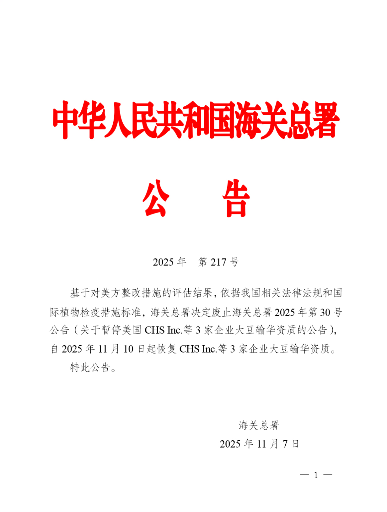 基于对美方整改措施的评估结果,依据我国相关法律法规和国际植物检疫措施标准,海关总署决定废止海关总署2025年第30号公告(关于暂停美国CHS Inc.等3家企业大豆输华资质的公告),自2025年11月10日起恢复CHS Inc.等3家企业大豆输华资质。