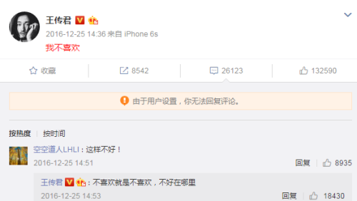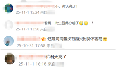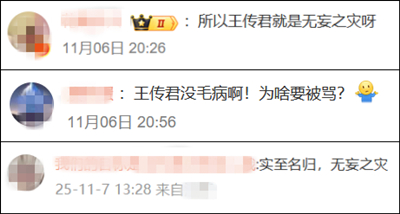 10月31日-11月2日,因古二曝光《繁花》剧本会录音,王家卫的公众口碑一夜之间急转直下,2016年电影《摆渡人》差评如潮时半个娱乐圈曾为其站队的事被翻出来了,王传君当年那句逆流而上的“我不喜欢”被网友奉为“人间清醒”,“关谷神奇,此身分明了”。